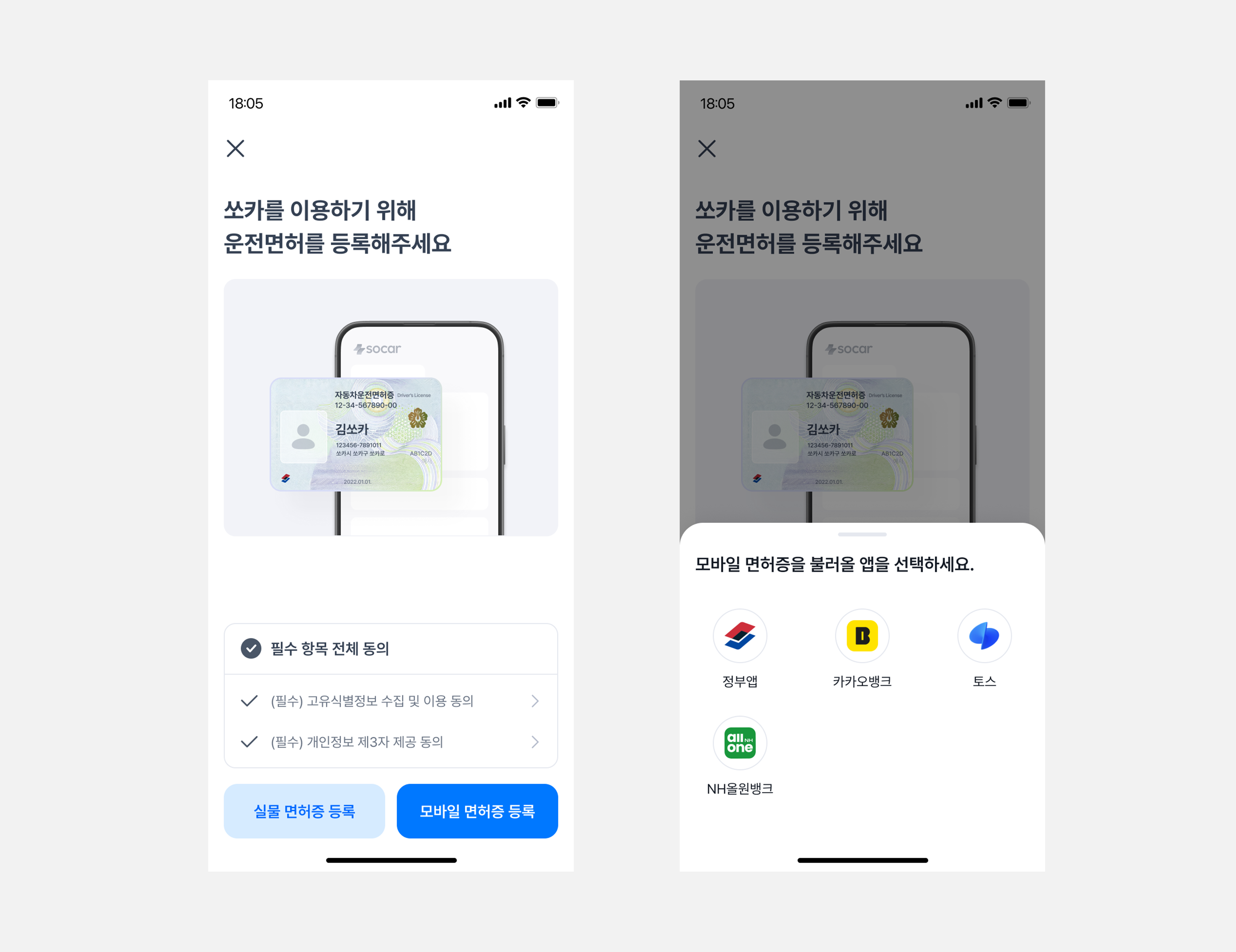 쏘카가 우리나라 운전면허 보유자가 3명 중 1명 꼴로 가입한 서비스*라는 걸 감안하면, 대다수의 쏘카 회원도 모바일 운전면허증을 갖고 있는 것으로 추산되는 상황이었어요. 보다 정확한 수치를 확인하고자 올해 쏘카 회원 1만명을 대상으로 자체 설문 조사도 진행했는데, 약 19%의 회원이 실물 면허증과 모바일 면허증을 모두 보유하고 있는 것으로 확인됐죠. 심지어 16%의 회원은 모바일 면허증만 가지고 있다고 했고요. 데이터를 종합했을 때 모바일 운전면허 인증 기능을 도입했을 때의 실효성이 충분히 보장돼 있는 상황이었어요. 더 이상 도입을 망설일 필요가 없다고 판단해 빠르게 프로젝트에 착수했습니다.