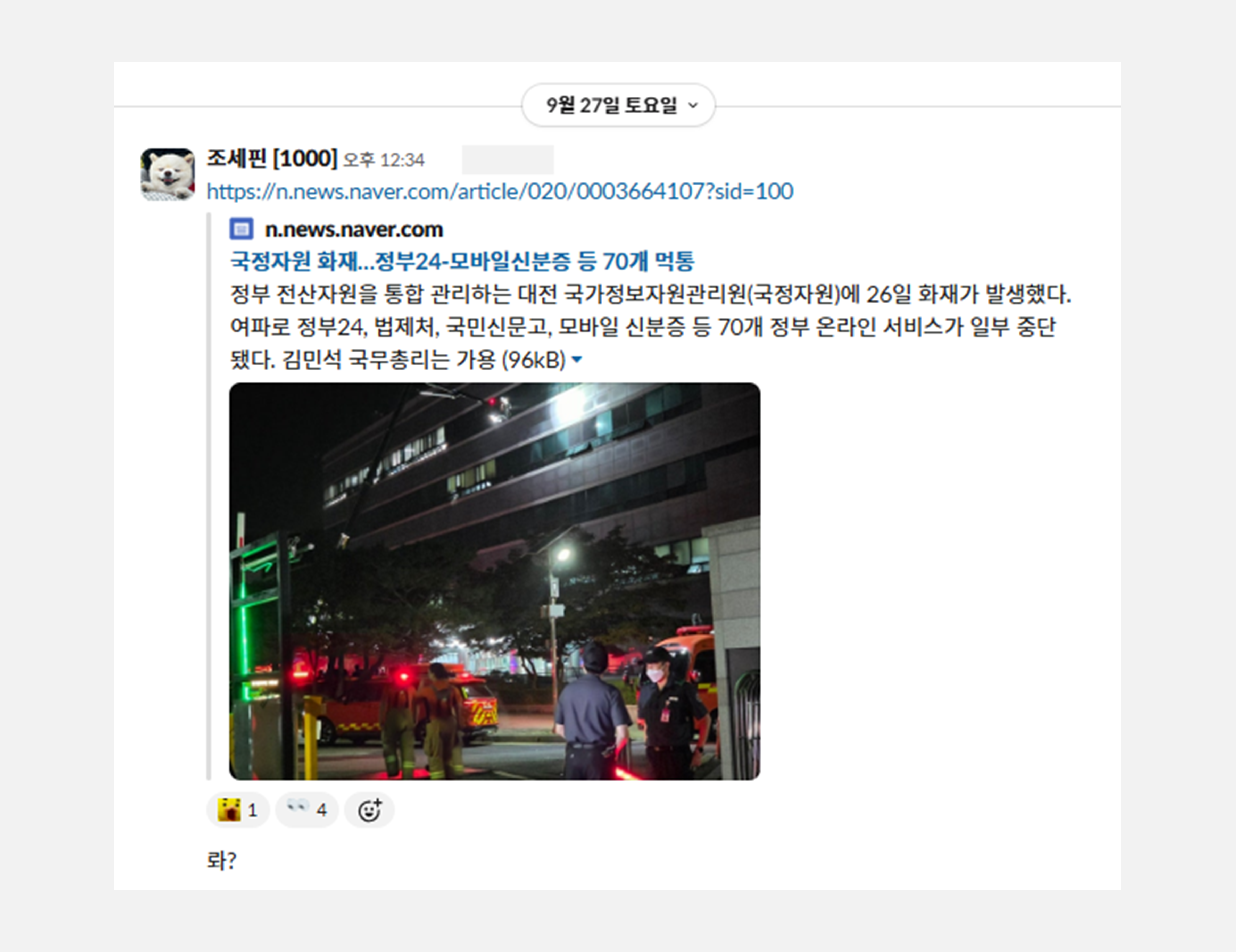 앱 배포 이틀 전 국정자원 화재 소식을 접하고 당황을 감추지 못한 조세핀