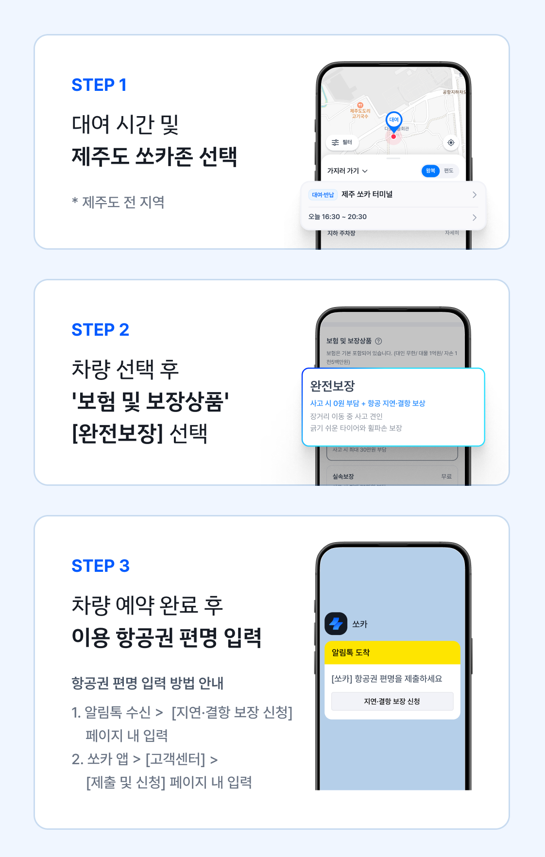 제주 쏘카존에서 렌터카 예약할 때 ‘완전보장’ 옵션 선택 → 항공편 입력하면 끝!