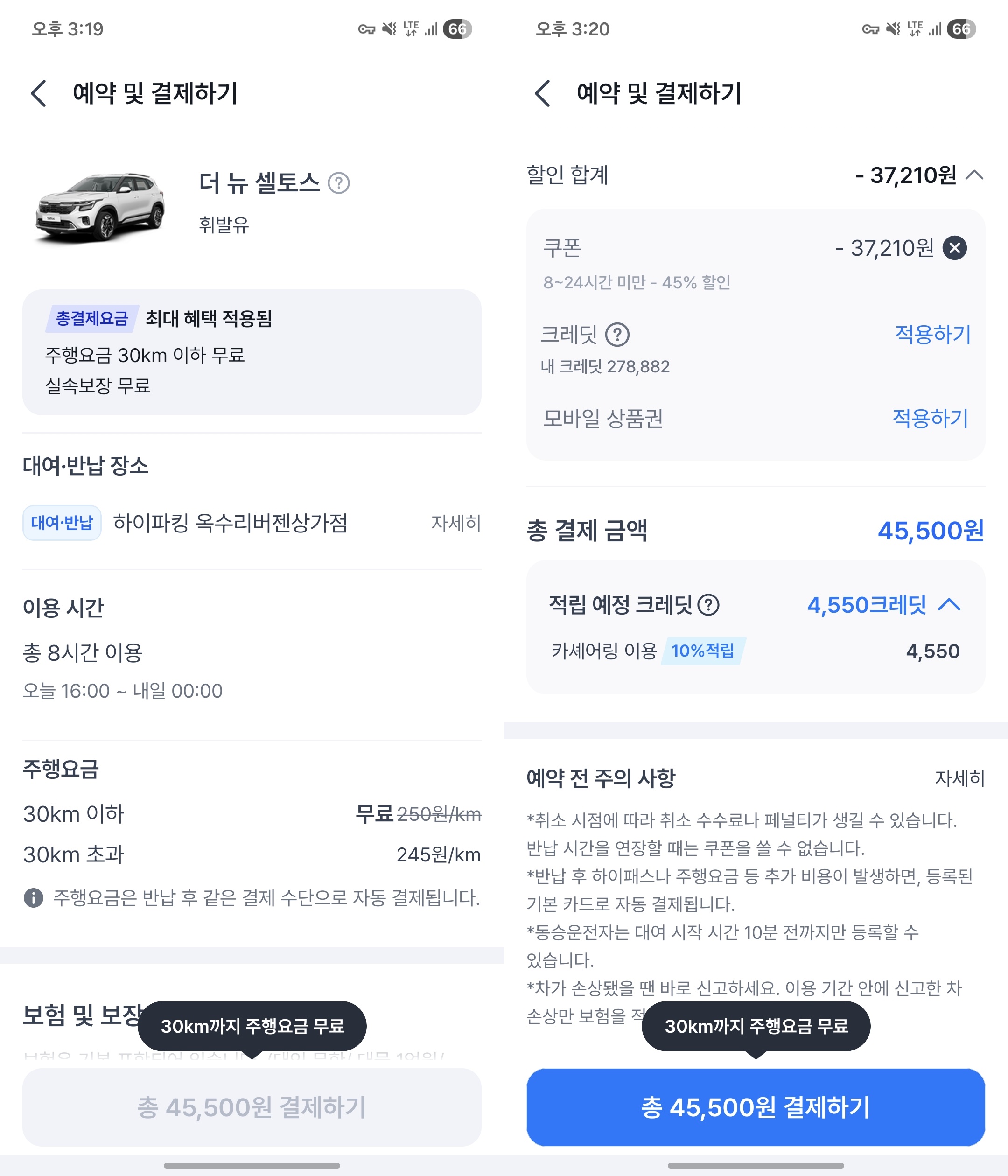 내연기관 차량을 빌렸나요? 30km 이내 단거리만 이동했다면 주행요금을 내지 않아도 돼요. (전기차는 전 구간 무료!) 50km를 이동했다면 20km 만큼만 주행요금을 나중에 지불하면 된답니다. 저는 옥수에 살고 있는데, 집에서 공연장까지 왕복으로 30km 안으로 들어와서 딱 대여요금만 내고 끝낼 수 있었어요.