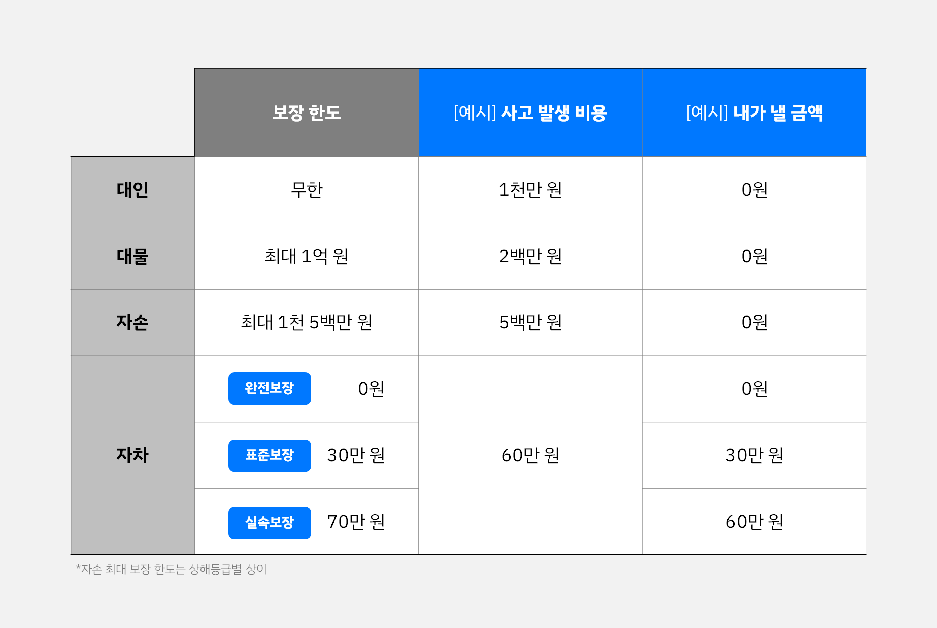 쏘카에서는 자동차종합보험, 차량손해면책 상품 등 탄탄한 보험·보장상품을 통해 상기 네 가지 피해를 모두 보장받을 수 있어요. 대인, 대물, 자손 피해를 보장하는 자동차종합보험은 쏘카를 예약하면 자동으로 가입이 완료되고요. 쏘카 차량(자차)에 대한 보험은 예약할 때 필수로 가입하게 됩니다. 보장 한도는 다음과 같아요.
